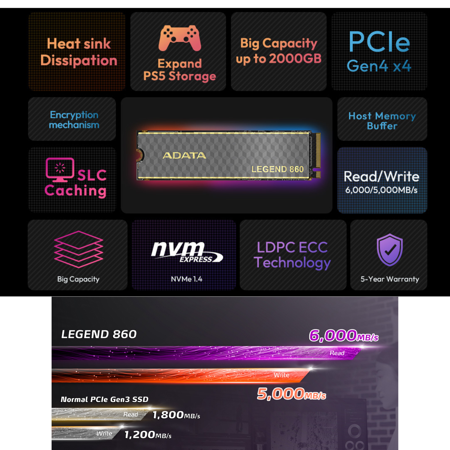 - The LEGEND 860 SSD leverages PCIe Gen4 x4 technology for unparalleled performance, offering read speeds of up to 5,000 MB/s and write speeds of up to 4,500 MB/s.